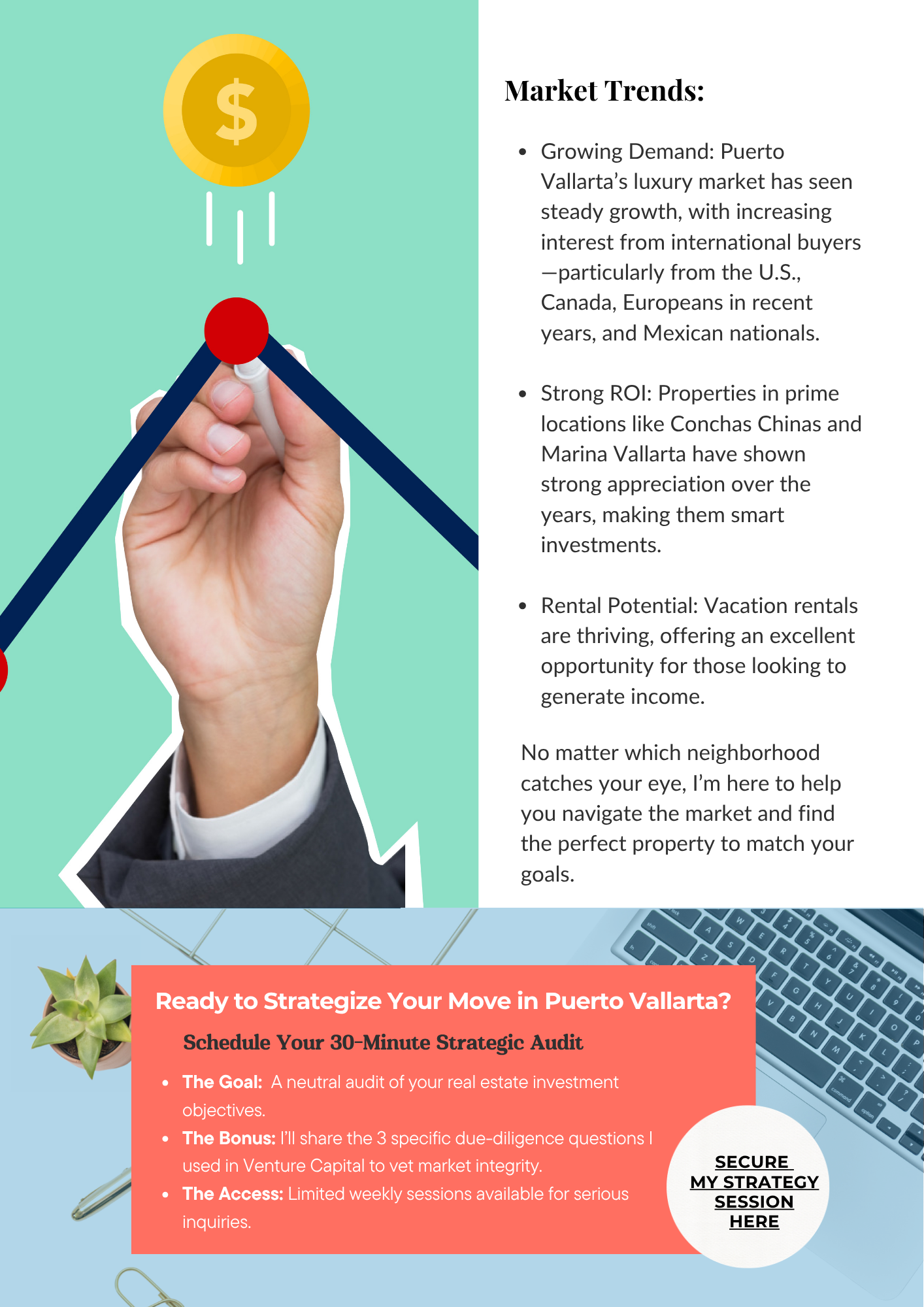 I offer a free 30-minute Strategy Audit — a neutral, no-pressure review of your goals, your budget, and the current market. You leave with clarity, whether you buy or not.